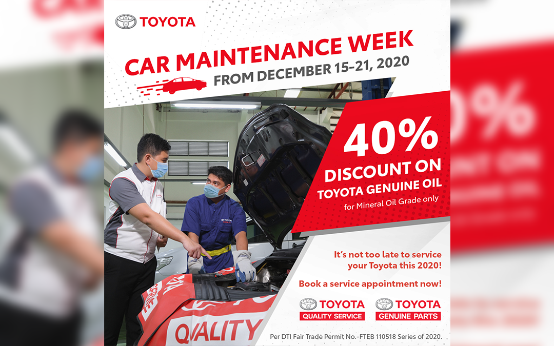 During Toyota’s Car Maintenance Week, all Toyota customers who will avail of Periodic Maintenance (PM) or Express Maintenance (EM) service at any Toyota dealership across the country will automatically receive 40% discount on Toyota Genuine Motor Oil- Mineral Grade.