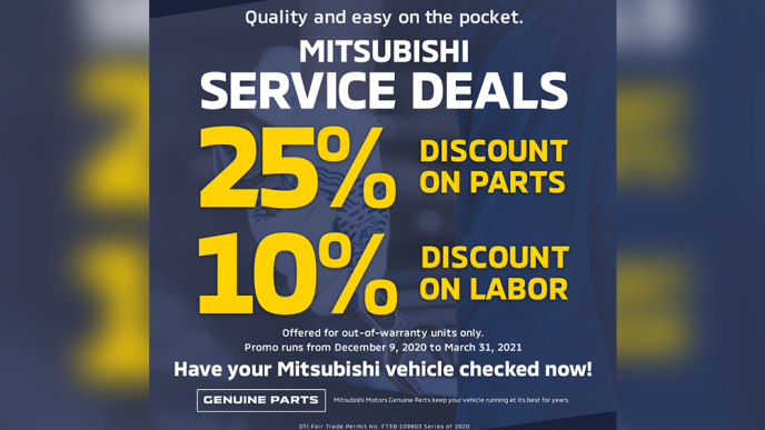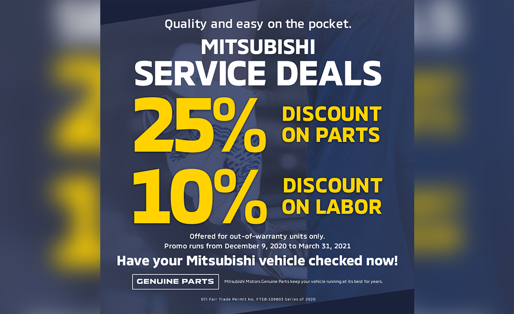 Qualified Mitsubishi vehicle owners are encouraged to avail of this exclusive offer. For more details about the service promo, visit www.mitsubishi-motors.com.ph or contact your local Mitsubishi dealer to arrange an appointment. Per DTI permit no. FTEB-109803 Series of 2020