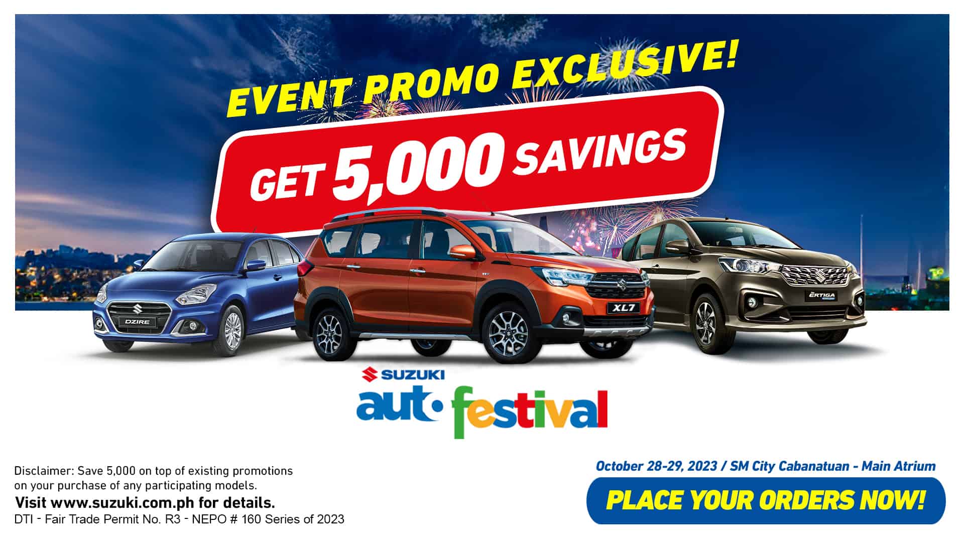 Customers who inquire, place an application and reserve the New Ertiga Hybrid, Dzire or XL7 during this 2-day Auto Festival will receive a P5,000 savings on top of ongoing promotions by Suzuki Philippines. Sales representatives and agents will be on hand to assist customers and Suzuki fans throughout the event for any inquiries regarding purchase, installment details, after-sales services and other pertinent information.