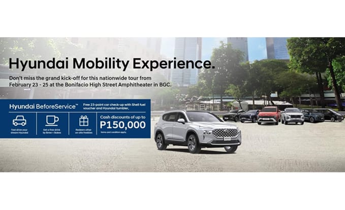 Hyundai Motor Philippines Inc. (HMPH) begins its Hyundai Mobility Experience (HME) tour in BGC at the Bonifacio High Street Central’s Amphitheater and C1 Open Parking Lot from February 23 to 25. This nationwide roadshow returns for a second year to allow even more Filipinos discover how the brand is innovating the car ownership experience.