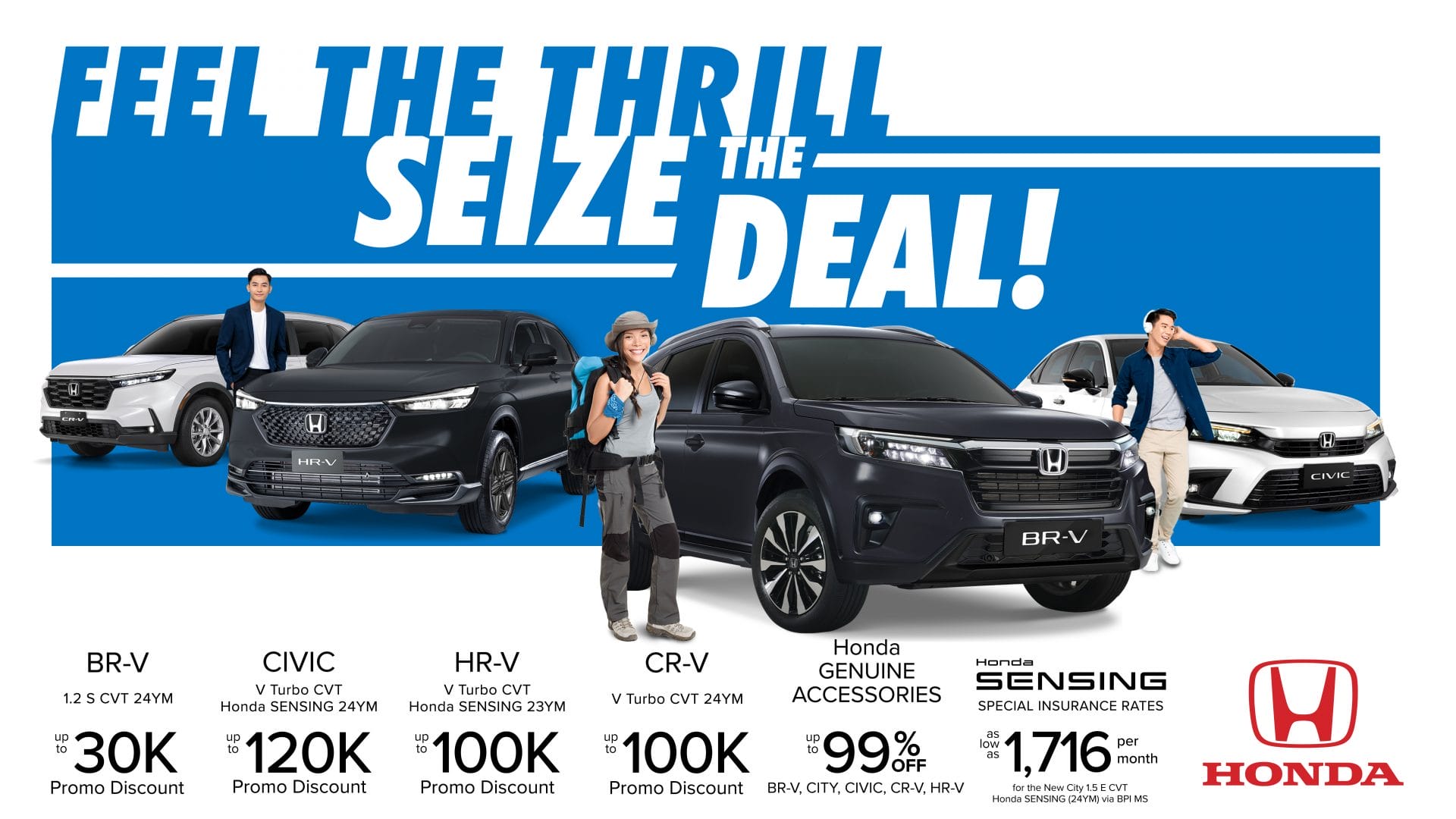 Feel the thrill of getting a Honda as Honda Cars Philippines, Inc. (HCPI) offers exciting discounts this June 2024. With HCPI’s “Feel the Thrill, Seize the Deal” promo, get as much as PHP120,000 savings on a Honda Civic V, CR-V V, HR-V V or BR-V S from June 1-30, 2024.