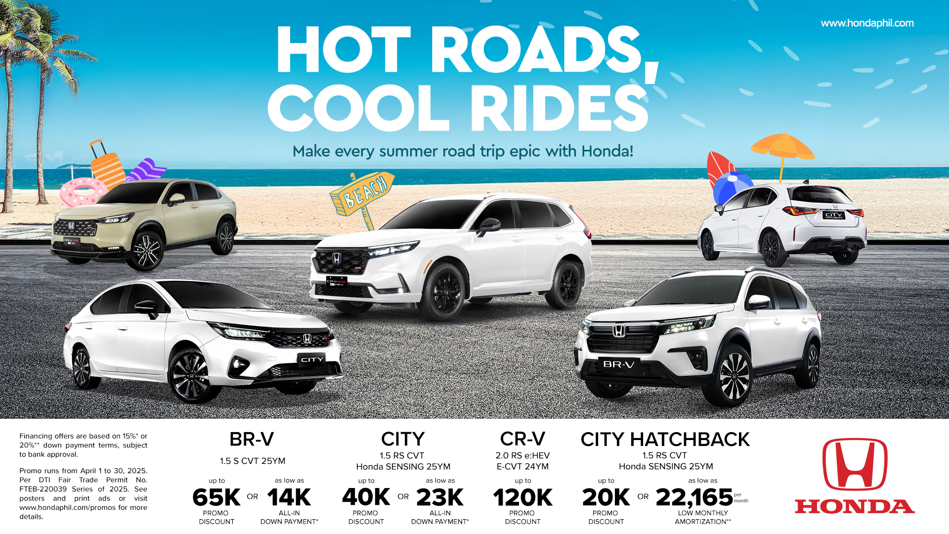 Drive into summer withthe continuation of Honda Cars Philippines, Inc. (HCPI) “Hot Roads, Cool Rides” promo. From April 1-30, 2025, customers can get as much as PHP120,000 discount on a new CR-V 2.0 RS e:HEV E-CVT, save PHP65,000 on a new BR-V 1.5 S CVT, avail PHP40,000 off on a new City 1.5 RS CVT Honda SENSING, or choose between PHP20,000 off or PHP22,165* low monthly amortization for a new City Hatchback 1.5 RS CVT Honda SENSING.