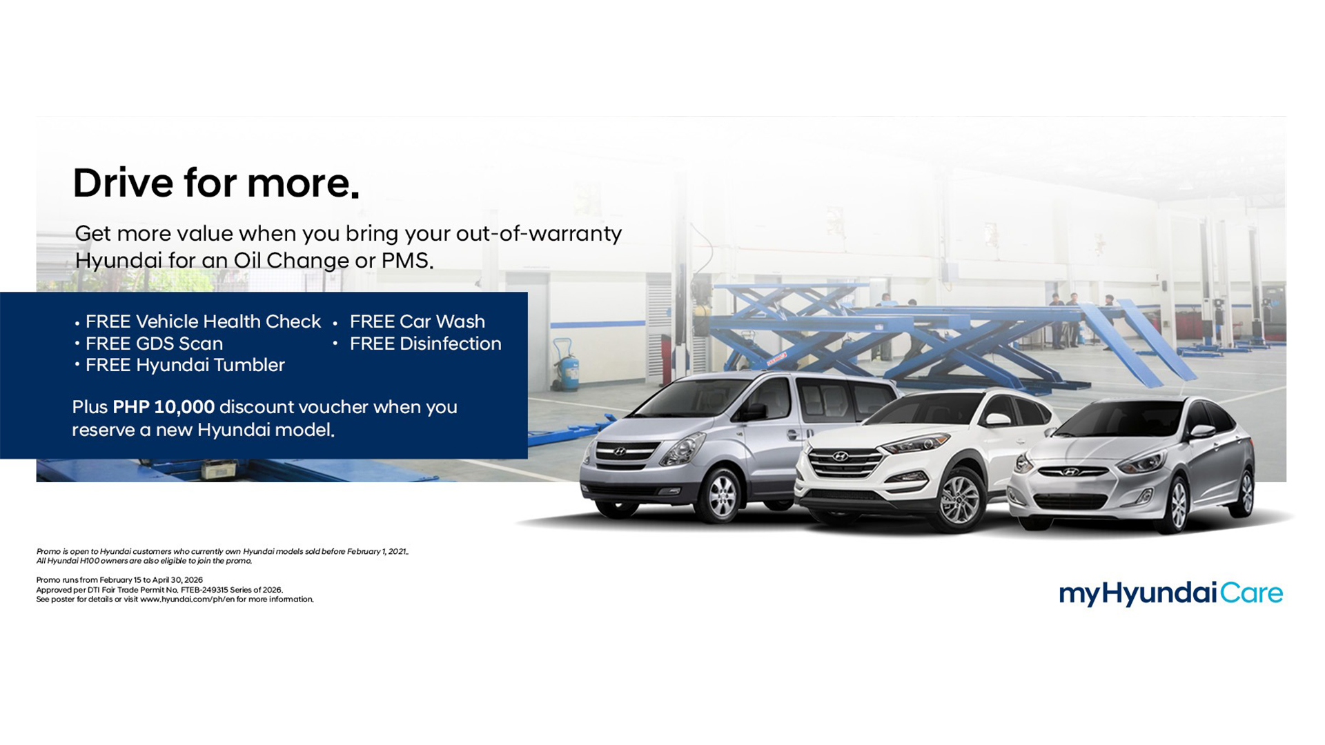 Hyundai Motor Philippines Inc. (HMPH) launches its “Drive for More” Service Promo, a nationwide aftersales initiative geared towards rewarding Hyundai owners who maintain their vehicles through regular Periodic Maintenance Service (PMS). Running until April 30, 2026, the promo is available at all authorized Hyundai dealerships for all customers who own Hyundai vehicles sold before February 2021 and all year models of the Hyundai H100.