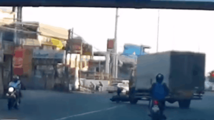 But a few meters after making the turn, the truck then slowed down and suddenly made a left – without signaling. A biker on the truck’s left side was hit – throwing him off his motorcycle as the vehicle all but disintegrated under the six-wheeler.