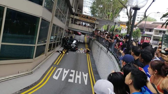 According to a report by The Strait Times, the car crashed through a metal railing before falling onto the side road of the busy Orchard Road next to the Lucky Plaza shopping center, hitting several pedestrians.