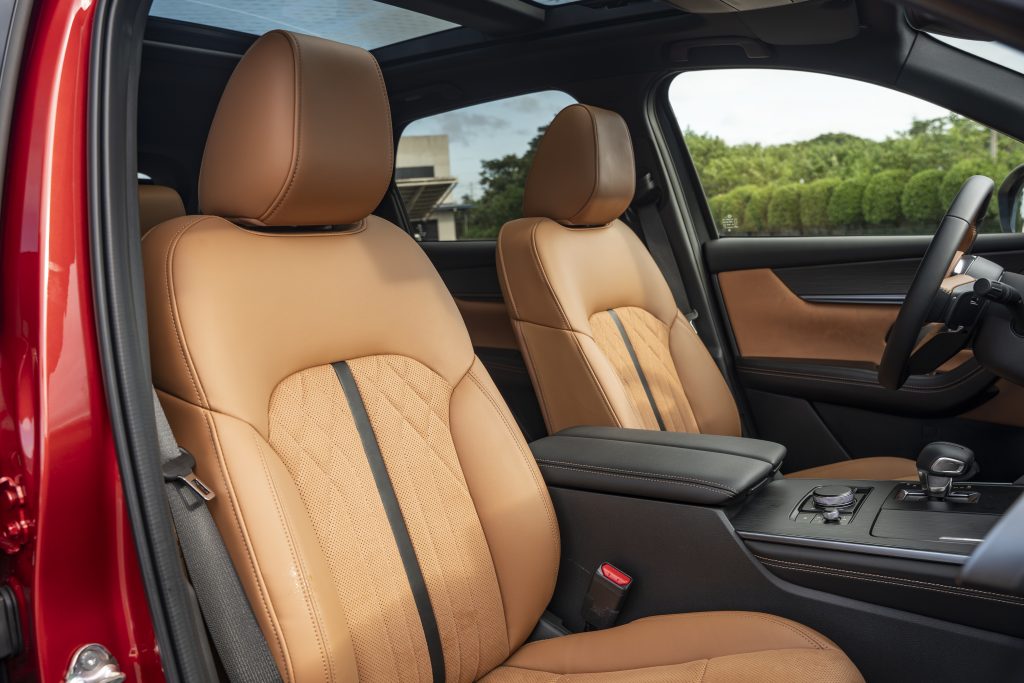 Inside, the 3.3 AWD HEV Turbo features aluminum and silver metallic accents, black Nappa leather seats, and black leather interior upholstery. The 3.3 AWD HEV Turbo-D Sport, meanwhile, offers graphite and gun metal accents, and tan Nappa leather seats with quilted Leganu suede inserts.