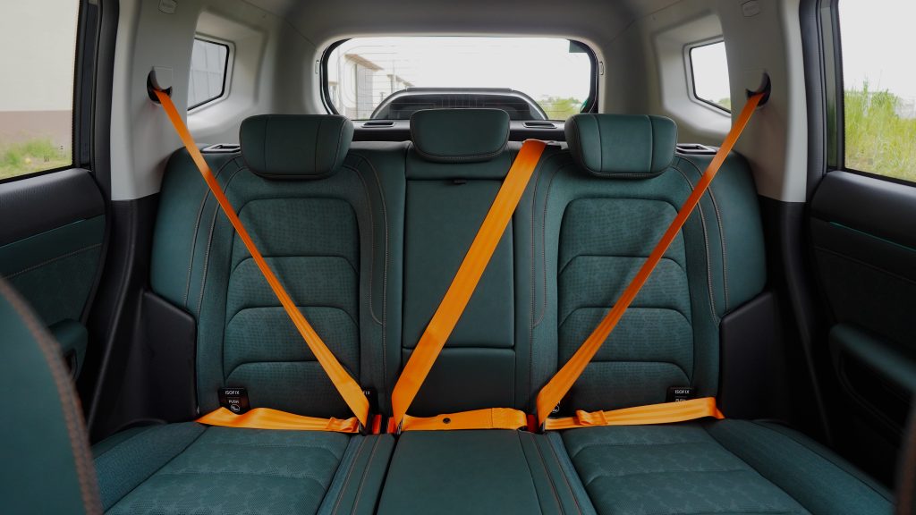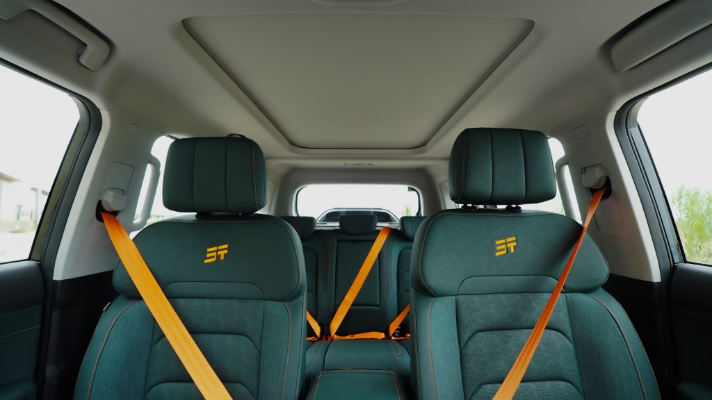 The JETOUR T2 Lightning i-DM BOSS Interior elevates the driving experience with an exclusive interior that exudes confidence and style. It showcases a refined cabin with sophisticated dark teal leather seats, boldly accented by neon orange branding and matching seatbelt detailing. This bespoke interior is designed for the modern professional who leads an active lifestyle and isn’t afraid to stand out.