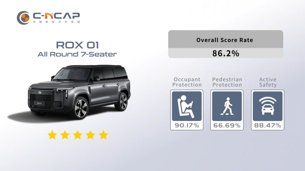 Safety remains a core pillar of the ROX 01. Its body structure consists of up to 87% high-strength steel, including 32% hot-formed steel, achieving torsional stiffness of 40,000 N·m/deg. The vehicle has earned full C-IASI “G” certification, a five-star CNCAP rating, and features a reinforced battery protection system using CATL 5-series lithium batteries with advanced thermal management and real-time monitoring.