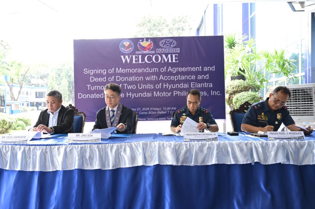 Hyundai Motor Philippines Inc. (HMPH) formally handed over two (2) Hyundai ELANTRA units to the Philippine National Police (PNP) in a ceremonial turnover attended by Acting Chief, PNP PGEN Jose Melencio C. Nartatez, The Director for Logistics PMGEN Martin E. Defensor Jr., Deputy Director for Logistics PBGEN Roel C. Rodolfo, members of the PNP Command Group, and other honored guests on February 27, 2026.