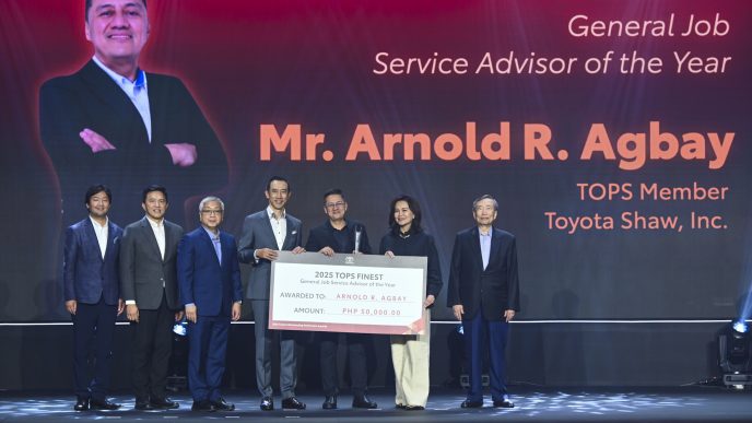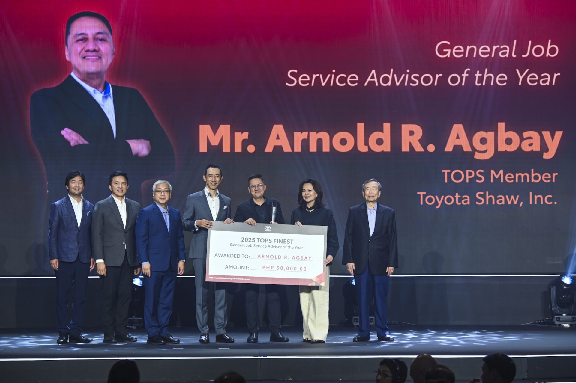 (L-R): TMP Senior Vice President for Marketing Ryo Yokoyama, TMP Senior Vice President for Marketing Sherwin Chua Lim, TMP Executive Vice President for Marketing Jose Maria Atienza, TMP President Masando Hashimoto, 2025 General Job Service Advisor of the Year Arnold R. Agbay of Toyota Shaw, Inc., TSI President Jonalyn Lim & TMP Vice Chairman Dr. David Go