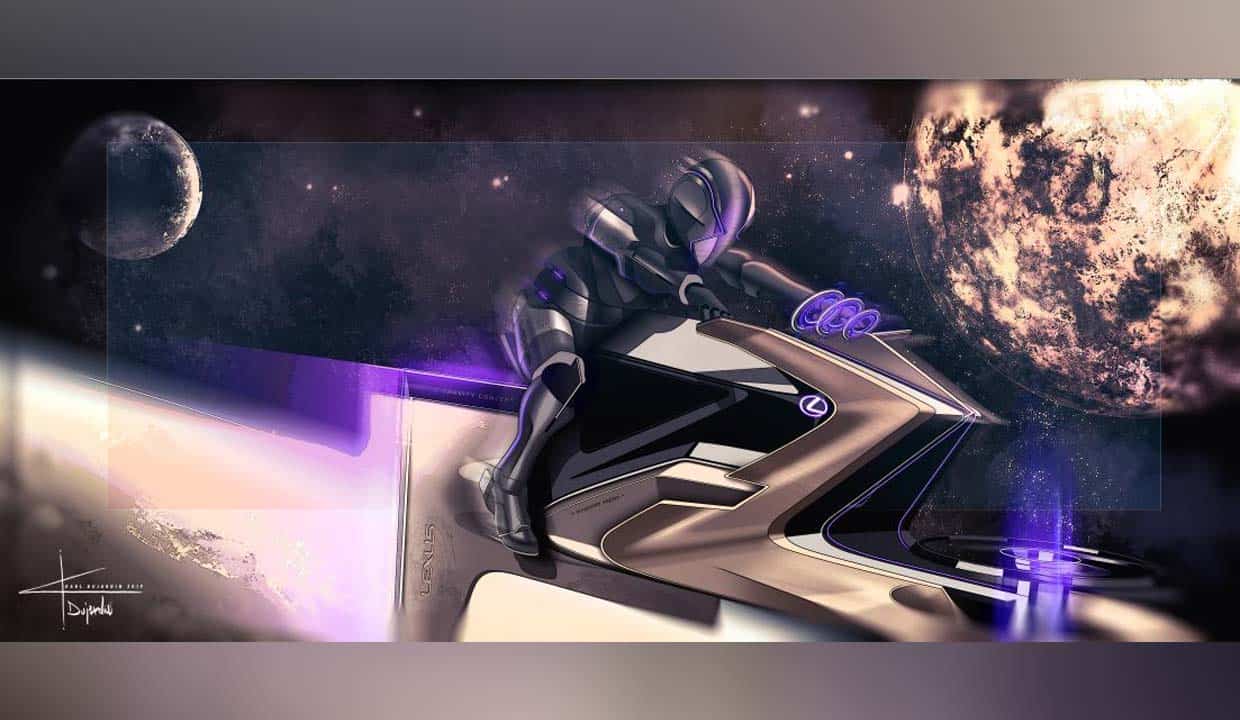 Zero Gravity, the concept sketch selected to appear in the print issue of the magazine, is a single rider vehicle that evolves the LF-30’s “Lexus Electrified” vision to incorporate Magnetic Levitation technology. The design reinterprets the signature Lexus spindle grill and uses the motorcycle-style of driving to employ the new concept of Tazuna (which mean “reins” in Japanese): the fundamental human-centered philosophy. Inspired by how a single rein can be used to achieve mutual understanding between horse and rider, the steering control provides active driving enjoyment created by the direct communication between human and machine.