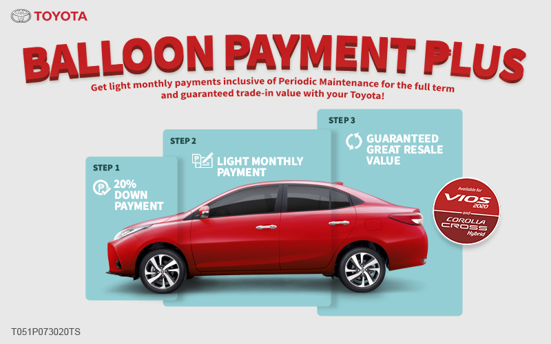 Balloon Payment Plus — offered by Toyota Financial Services Philippines Corp. which is supervised by the Bangko Sentral ng Pilipinas ([email protected])—is a finance lease product that makes your Toyota experience affordable with low monthly payments. This product is also top quality as it comes with built-in periodic maintenance throughout the finance term, and with convenient end of term options.