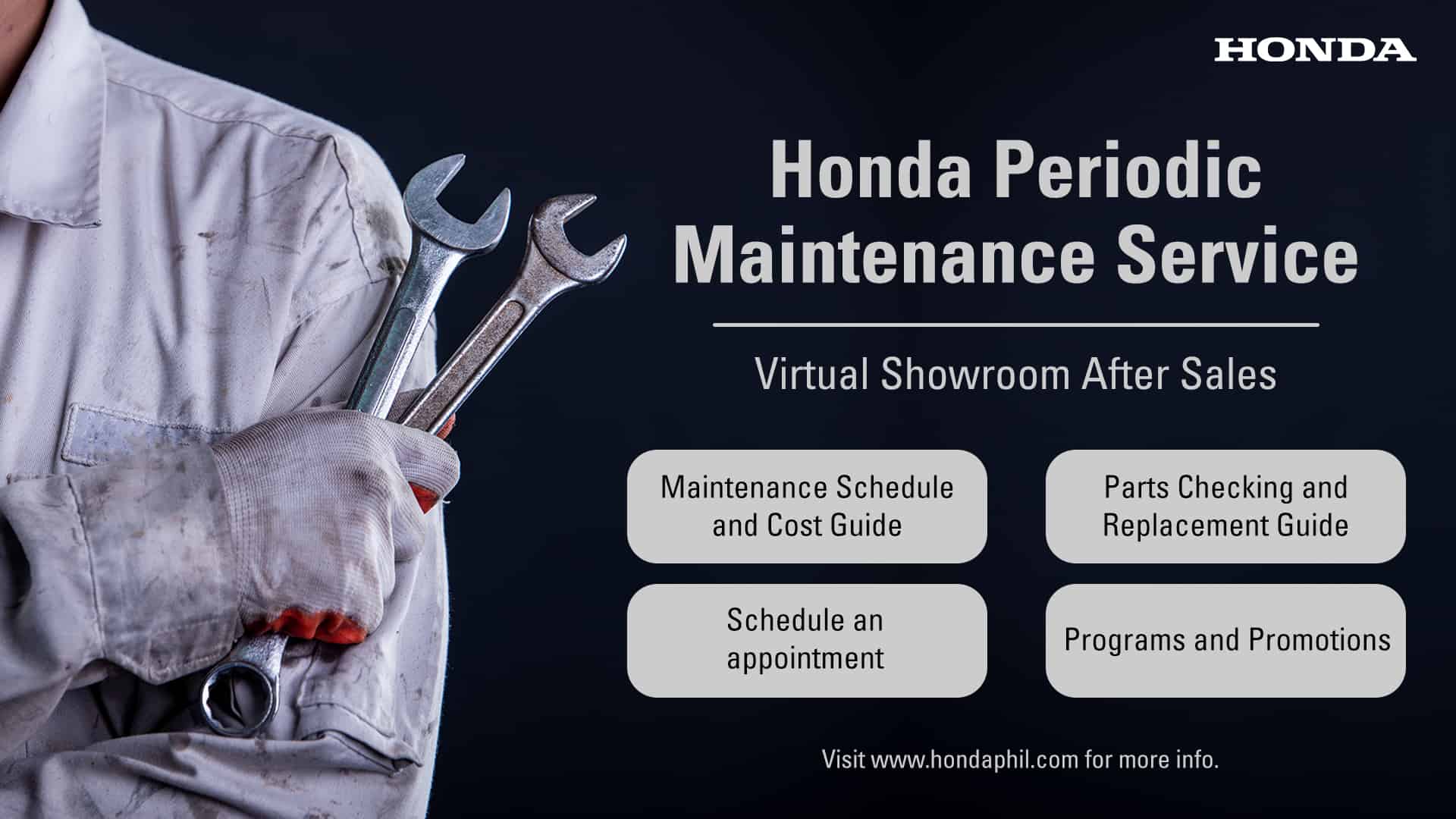 We get you. You have invested in your vehicle and of course you want to keep your family safe and comfortable. And you would not want any breakdown or unnecessary expenses to go with that. Honda respects that and we value your trust. This is why keeping your car in its best condition is top priority for us through excellent after-sales service minus the expensive charges. And don’t just take our word for it. Be well informed and know how much the periodic maintenance services actually cost.