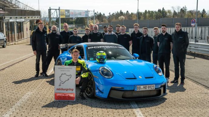 Porsche Tequipment is offering a Manthey Performance Kit for the current 911 GT3 for even better circuit performance. A 911 GT3 with the Manthey Performance Kit, powered by a 375 kW (510 PS) engine, posted a lap time of 6:55.737 on the Nürburgring’s famed North Loop, the Nordschleife. This makes it exactly 4.19 seconds faster than the 911 GT3 without the kit. The modifications are focused on aerodynamics and chassis components. The new Performance Kit was developed in close collaboration between the Porsche engineers in Weissach and the Nordschleife specialists from Manthey in Meuspath. The Porsche Tequipment circuit-optimised components are sold through Porsche Centres.