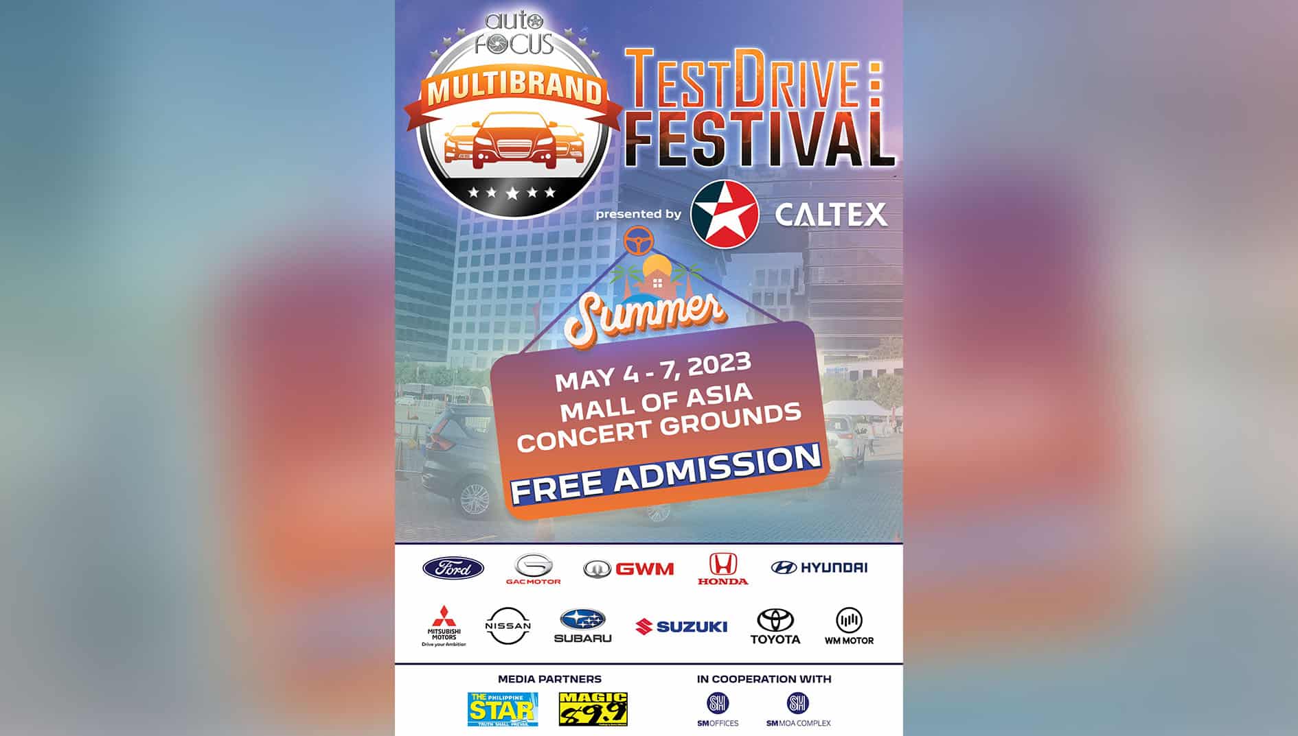 The 2023 AUTO FOCUS SUMMER TEST DRIVE FESTIVAL presented by CALTEX in cooperation with SM Offices and SM Mall of Asia Complex will be open from 11:00 AM to 9:00 PM throughout its 4-day run at the MOA Concert Grounds. Admission to the public is free.