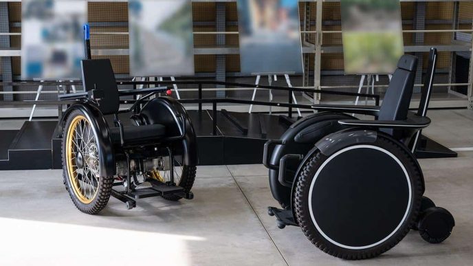 For the wheelchair’s drive system, engineers used electric power steering motors normally found in cars. The torque they deliver improves safety by ensuring that the tires do not counter-rotate when ascending or descending.