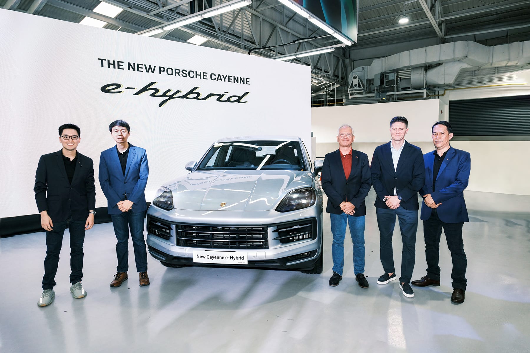 Presenting the new Cayenne E-Hybrid are (from left) Porsche PH Managing Director William Angsiy, Porsche PH President and CEO Roberto Coyiuto III, German Ambassador Andreas Pfaffernoschke, Porsche Asia Pacific CEO Hannes Ruoff, and Porsche PH Aftersales Head Marco Mejia