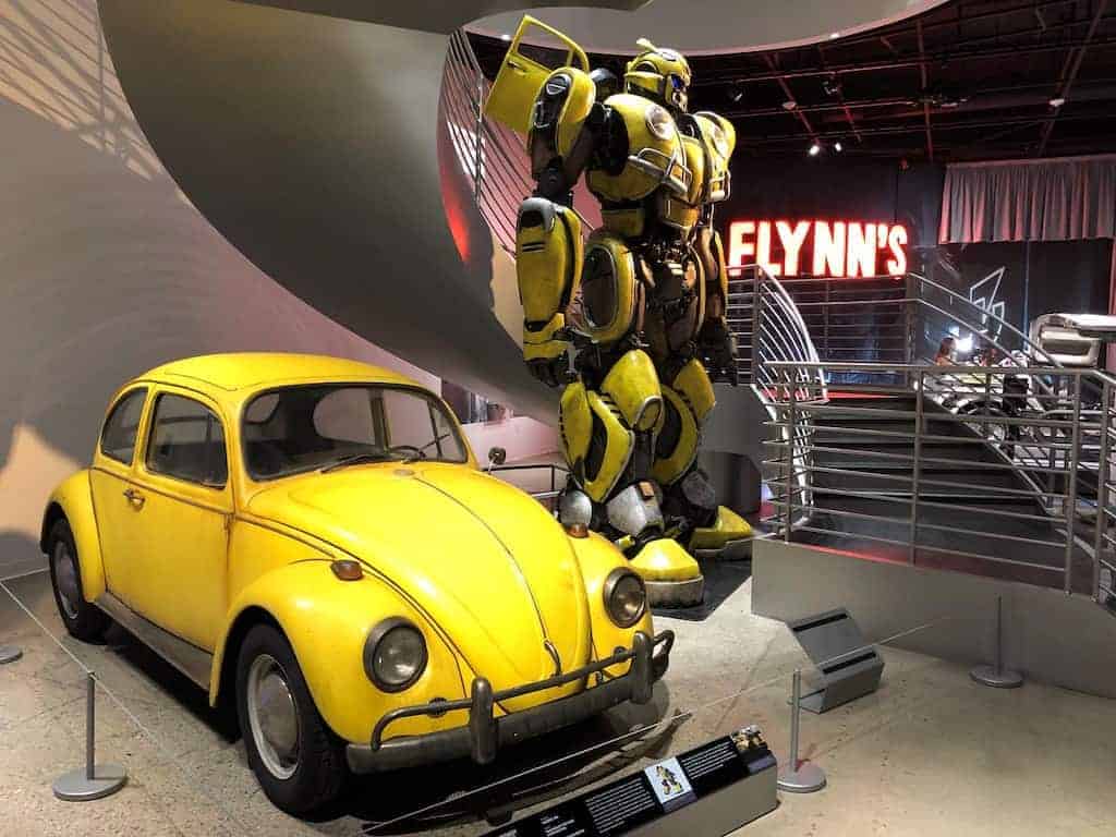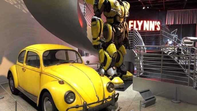 Key vehicles on display include the 2018 Lexus LS 500 F Sport from “Black Panther,” Warthog from “Halo,” the 2035 Audi RSQ from “I, Robot,” the time machine from “Back to the Future,” the Weyland Industries RT01 Group Transport from “Prometheus,” the 2008 Audi R8 from “Iron Man,” Bumblebee from the “Transformers” series, the GM Ultralight from “Demolition Man,” Batmobiles, and more.